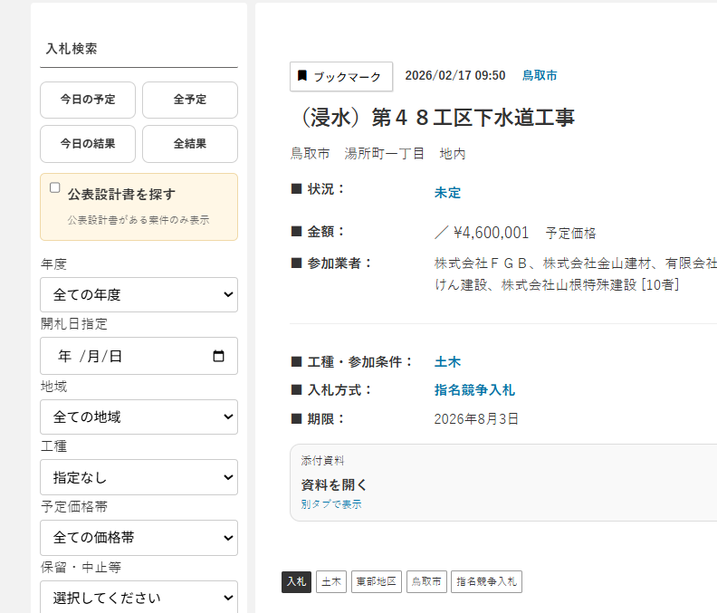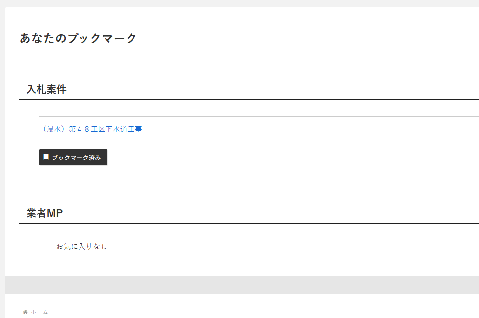 「ブックマーク」ページは、入札予定・入札結果・業者情報など、業務で頻繁に参照するデータをブックマークとして整理できる管理ページです。継続的に追跡したい案件や、動向を確認したい業者を登録しておくことで、毎回検索する手間が省け、確認作業をスムーズに進められます。「入札」や「業者」ページのブックマークボタンを押すと登録できます。