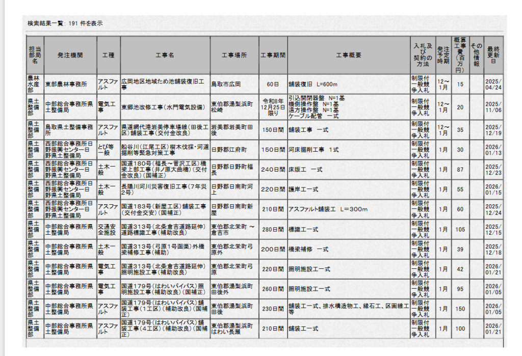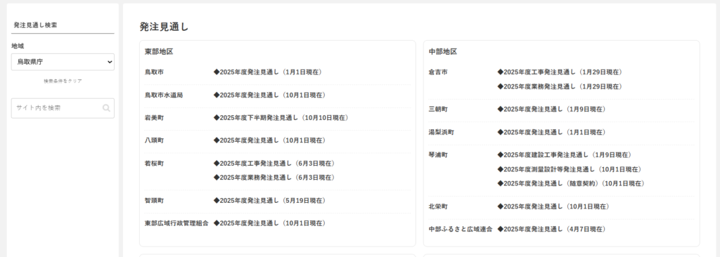 このページでは、発注機関ごとの発注見通しを一覧で確認できます。年度内に予定されている工事名、業務内容、発注時期など、入札準備に必要な情報をまとめて把握できます。