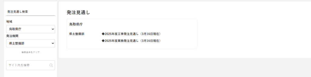 「発注機関」から、その地域の確認したい発注機関を選ぶことができます。(例:県土整備部)